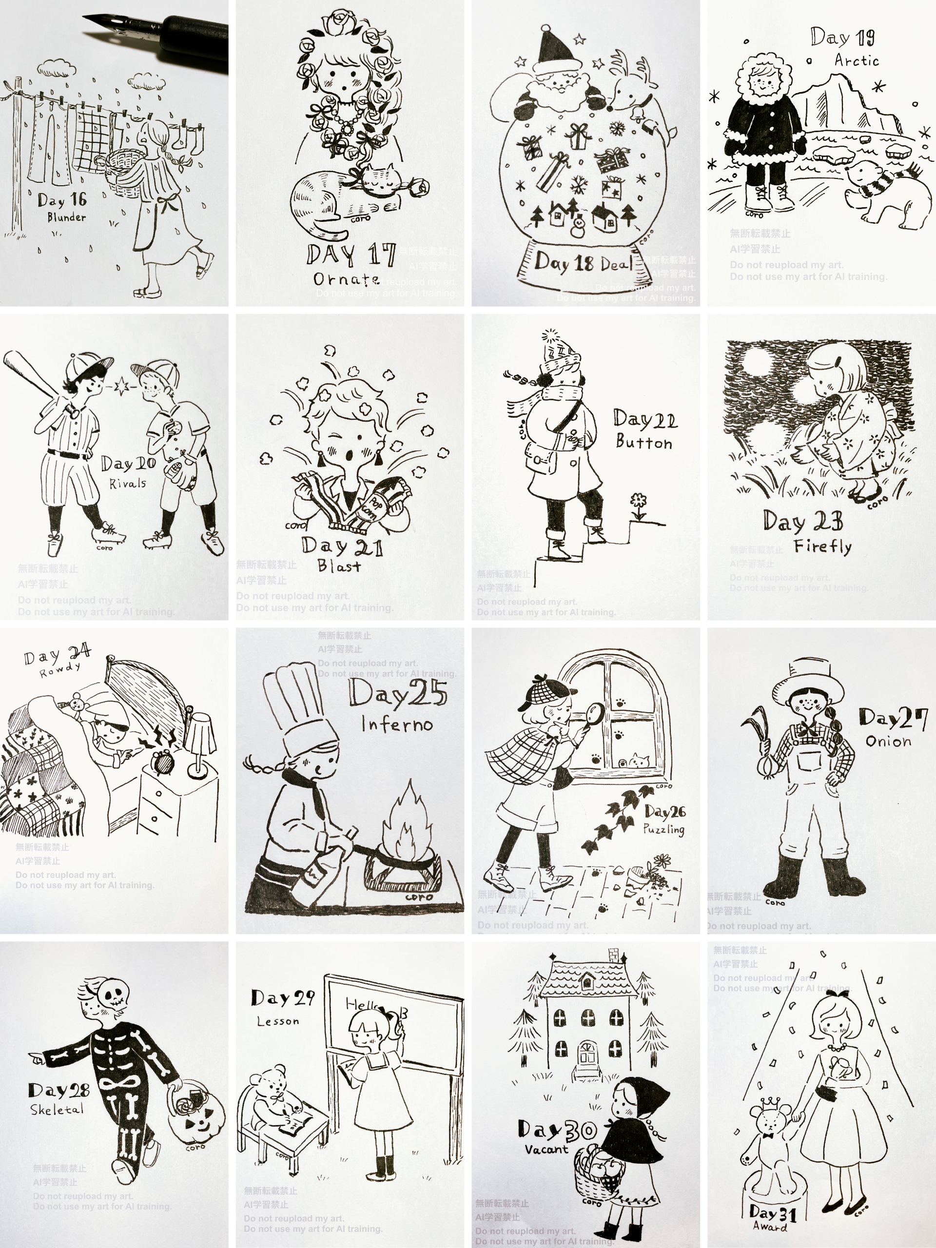 アナログイラスト2025 Personal works 2025.11 アナログイラスト2025 Oct,2025 Keywords ・アナログイラスト ・タッチC(主線あり、インク、ガラスペン、Gペン) ・人物、子ども、動物、イベント、植物、食べ物、夜、春、夏、秋、冬、線画