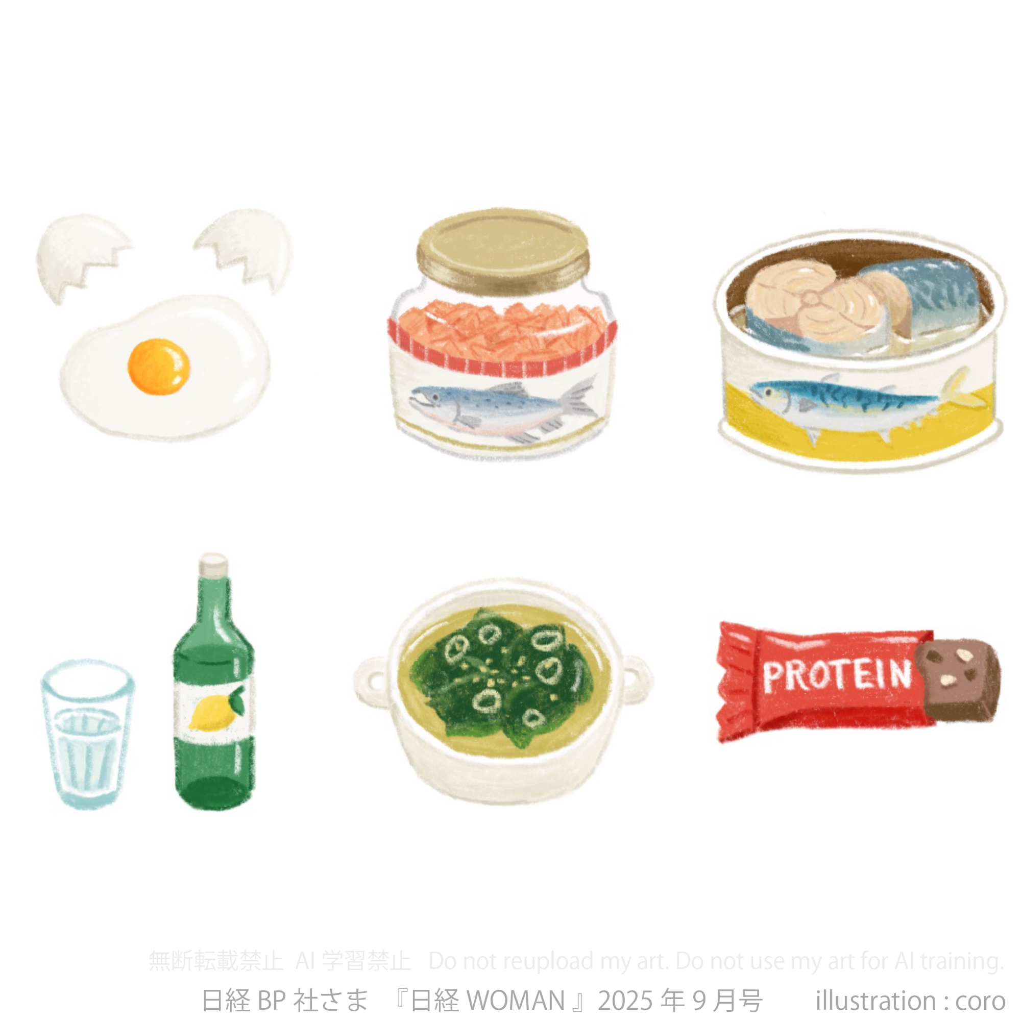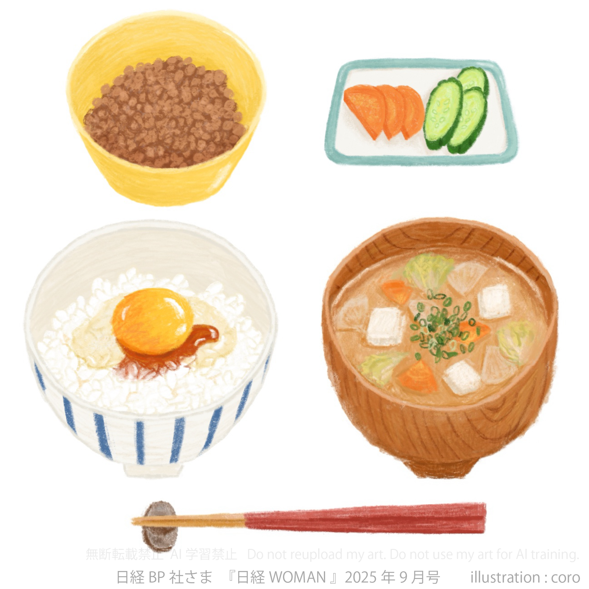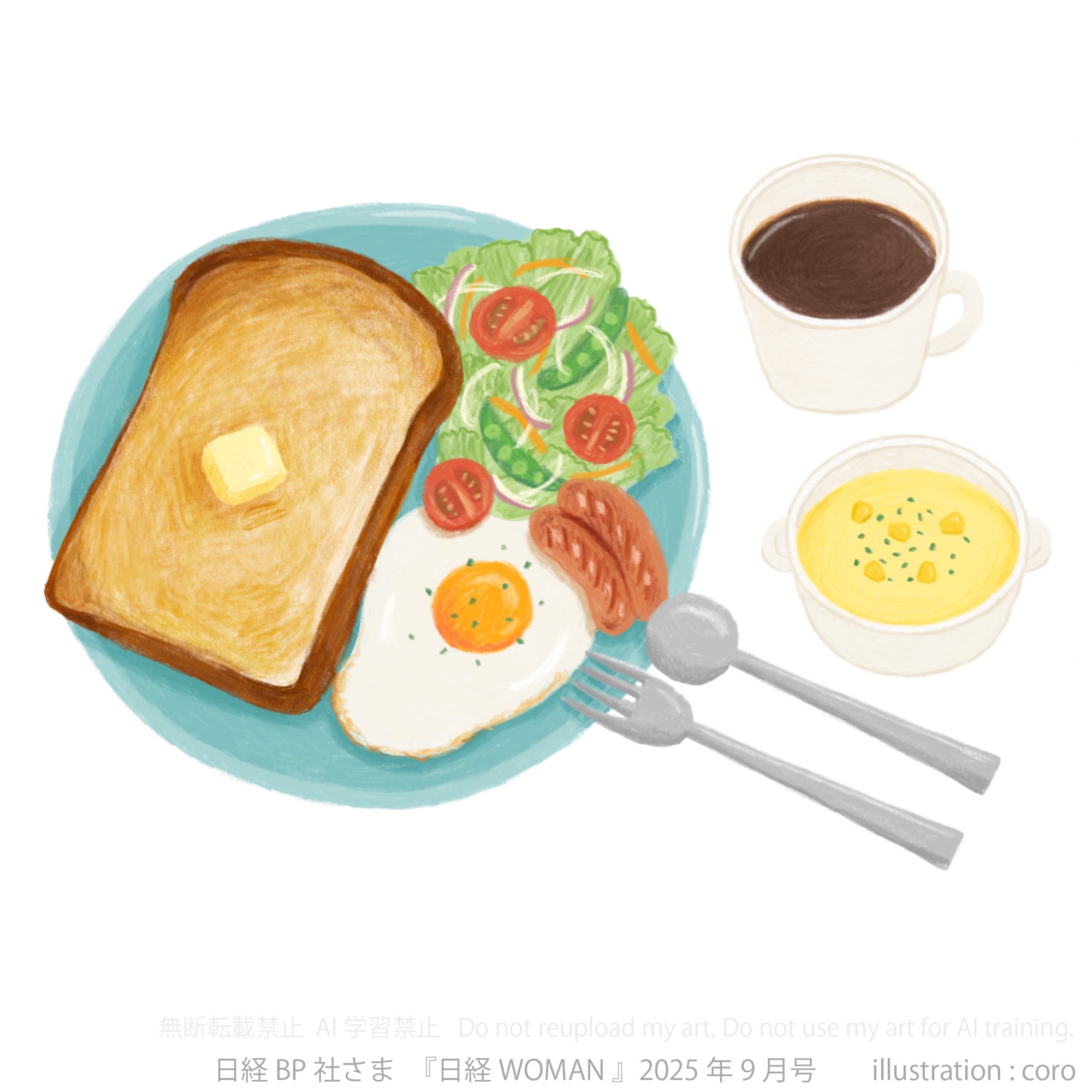 日経BP社さま 『日経WOMAN』2025年9月号「最強朝ごはん6つのルール」の特集で 扉絵とカットイラスト9点を描かせていただきました。